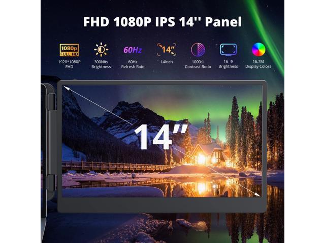 [(High Dynamic Image Quality)] 14'' FHD IPS Portable laptop monitor provides an ideal display extension with 1080P resolution and 300 nits brightness. The 1000:1 contrast ratio enhances visual depth, allowing you to efficiently multitask using the display for presentations, reference materials or video streaming while working simultaneously on your main device.