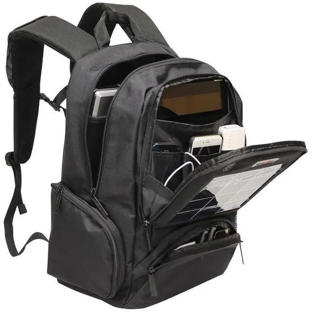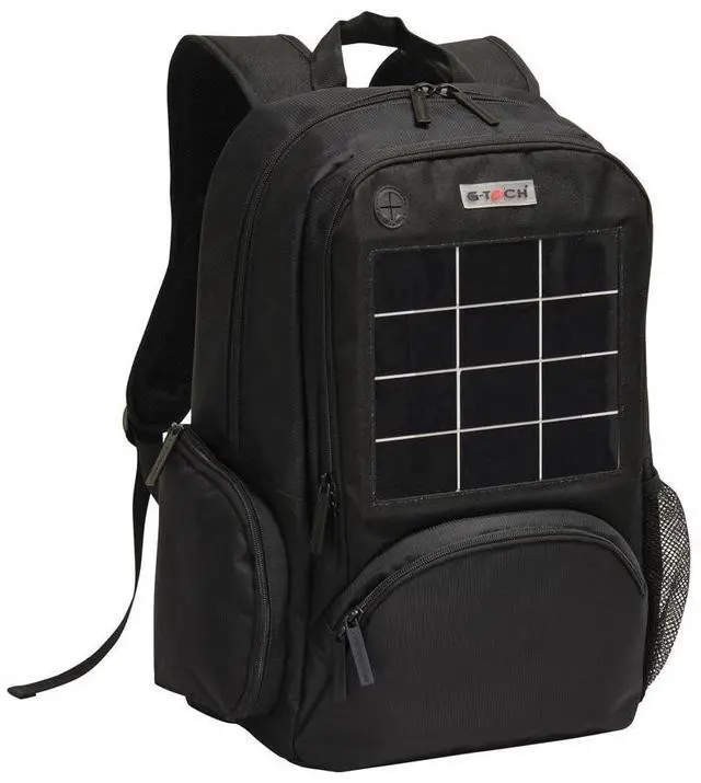 DescriptionNever worry about your mobile devices running out of power! Designed with industrial-grade solar cells which charge quickly in direct sunlight. Simply plug your original USB charging cable into the USB port provided on the bag and stand in direct sunlight to begin charging! It charges most brands of cell phones & tablets via USB. The backpack is packed with features including multiple zip compartments with pockets for storage and a sleeve for a tablet. The spacious main compartment has a padded sleeve for a 15.4 inch laptop. Sides of the backpack have a zip pocket for accessories and a mesh pocket for water bottle.
