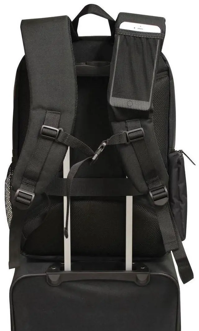 • On the backpack strap there is an elastic mesh pocket for easy access to your phone while charging. The back has extra wide padded backpack straps and a chest buckle for maximum comfort. Finished with a trolley strap for easy transport