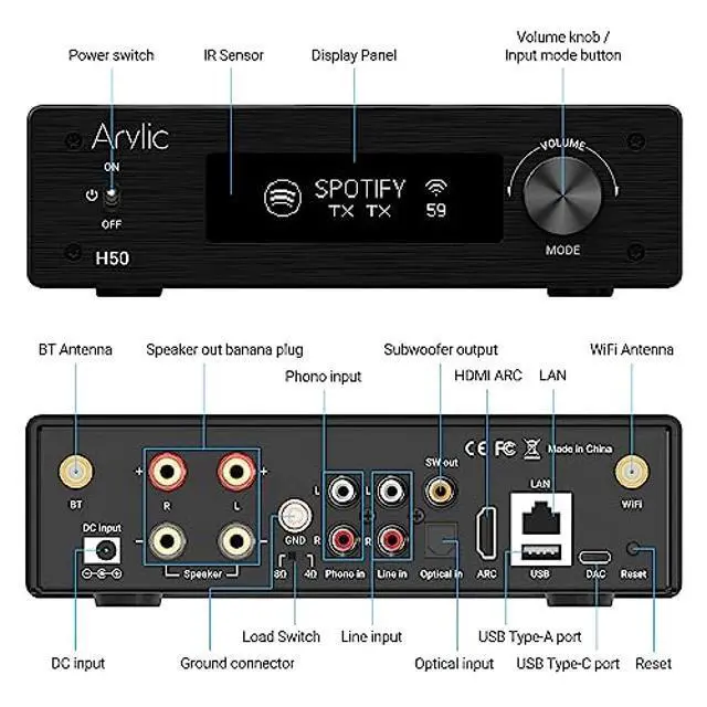 50Watts Dual Channel & Rich Interfaces: H50 is a 50Watts Dual channel amplifier comes with rich interfaces,including RCA Input, Optical Input, HDMI ARC, Phono In, and USB DAC. Transmit multiple audio sources from laptops, TVs, Turntables, Xbox, set-top boxes to your Bluetooth Speakers or headphones wirelessly. The Arylic H50 also comes with a subwoofer output to adding active subwoofer for more bass.