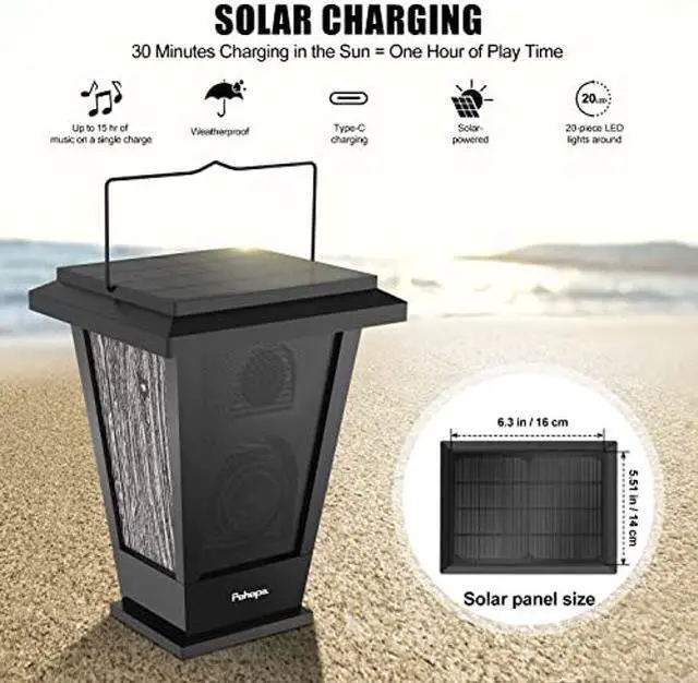 SOLAR POWERED: Set Pohopa EF-B210S outdooor Bluetooth speakers in your outdoor area for solar charging - takes about 10 hours in the sun for a full charge(4.5 hours via inclueded power cord). 6.3"x5.5" high efficient waterproof silicon solar panels. Half hour sunlights, 30 minutes music playtime. Play and charging at the same time You can basically say goodbye to the charging cables.