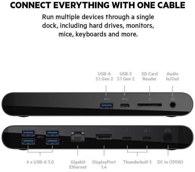 Introducing the Thunderbolt 3 Dock Pro - the ultimate docking solution for your Mac or Windows laptop. This smart, fast, and streamlined dock offers innovative solutions designed to suit both professional and at-home users. Enjoy super-fast data transfer speeds of up to 40 Gbps*, high-definition dual monitor support, and 85W upstream charging to power your connected laptop. It also features multiple ports to connect your peripherals and networks via USB-A, USB-C, Ethernet, SD, and more. Connect multiple devices to your laptop through a single dock, including monitors, hard drives, drawing tablet, mouse, keyboard, internet, and more.