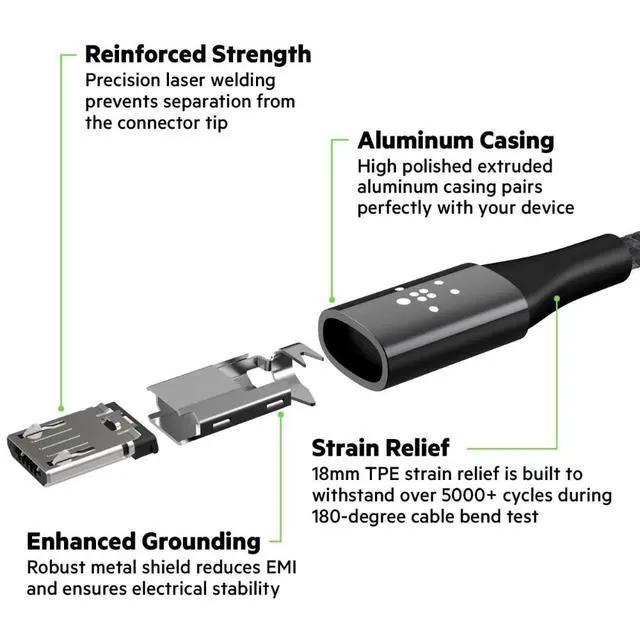 Not just any charge cable, Duratek was forged from superior quality materials for ultimate durability. Kevlar fibers reinforce the inner wiring for added strength, abrasion-resistant nylon forms a tough outer jacket, and highly flexible insulation minimizes damage from friction. The strength created by these resilient ingredients is further enhanced by smart design details to reinforce the cable at its stress points. This ensures the finished product can withstand even the most demanding routines, and perform above and beyond expectation to deliver a cable that borders on indestructible.