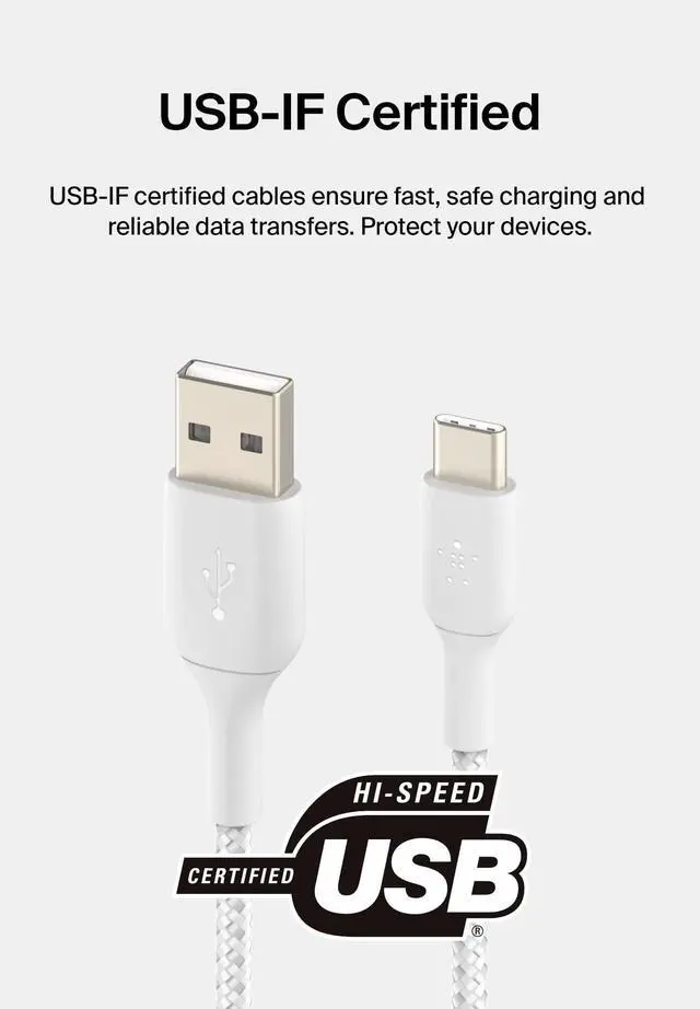 Keep your USB-C devices charged or sync music and photos from any USB-A port with durable USB-C to USB-A cables you can use just about anywhere while enjoying a more durable cable with this Braided USB-C to USB-A Cable. Made with enhanced braided nylon for added flexibility and strength, tested to withstand 10, 000+ bends, and with USB-IF certification, you can count on worry-free performance. This 6.6 ft charger is perfect to replace a damaged charger and is built for a long lifespan and will work with any standard USB-A port. This Belkin BoostCharge Braided USB-C to USB-A Cable comes in a variety of lengths and in white and black cable colors, this phone charger can seamlessly blend in with your home or office decor.