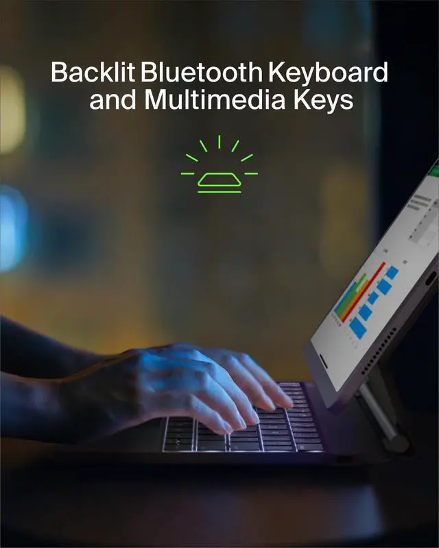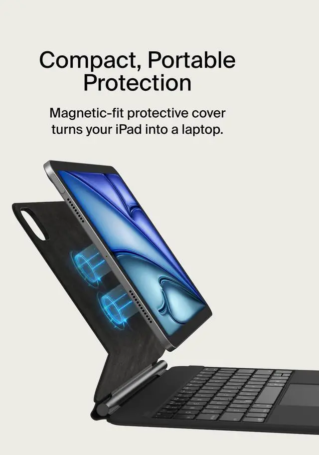 Transform your iPad into a laptop for greater productivity. The Belkin Pro Keyboard Case with Magnet Stand uses Bluetooth technology to pair to your iPad, combining the ease of use of an external keyboard with the added defense of a protective cover. With this keyboard case, you'll enjoy backlit keys that help you work in darker spaces without guessing, as well as a large, click-anywhere trackpad that caters to comfort and productivity. Plus, the premium faux leather exterior protects your tablet, while a soft anti-slip interior protects your screen from scratches.