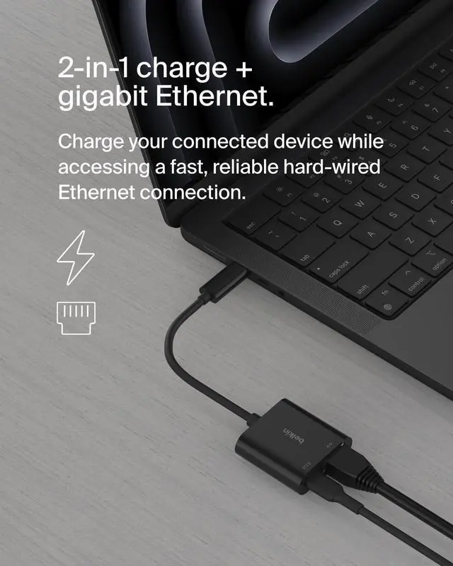 Boost your power with the Belkin Connect USB-C to Ethernet + Charge Adapter. With this travel-friendly adapter, you'll enjoy 100W USB Power Delivery plus a Gigabit Ethernet connection supporting [10/100/1000] Mbps for a fast internet connection. Its lightweight design makes it easy to work anywhere without the hassle of a bulky adapter. Plus, a durable build and 2-year warranty allow you buy with confidence. Belkin is an established accessories market leader creating high-quality, innovative tech solutions for 40 years.