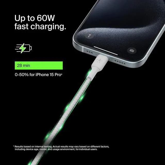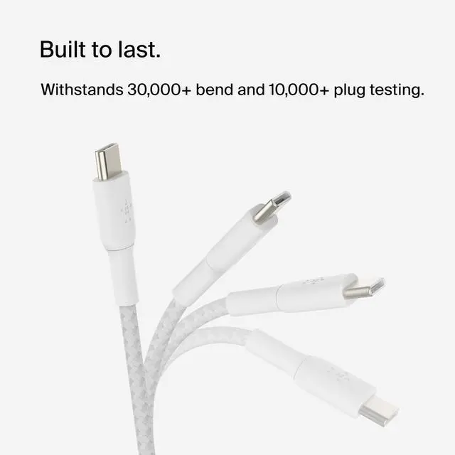 Get a fast charge, up to 50% in around 36 minutes with strong braided USB-C to USB-C cables that are built to last. Use them at home, in your car, or anywhere you need to sync music, photos, or data and charge your devices. Tested to survive 10, 000+ bends, and made with double braided nylon, these USB-C fast charge cables stand up to the most rigorous daily use so you dont have to keep replacing them. And with a braided nylon exterior theyve got the sturdiness to withstand just about anything.