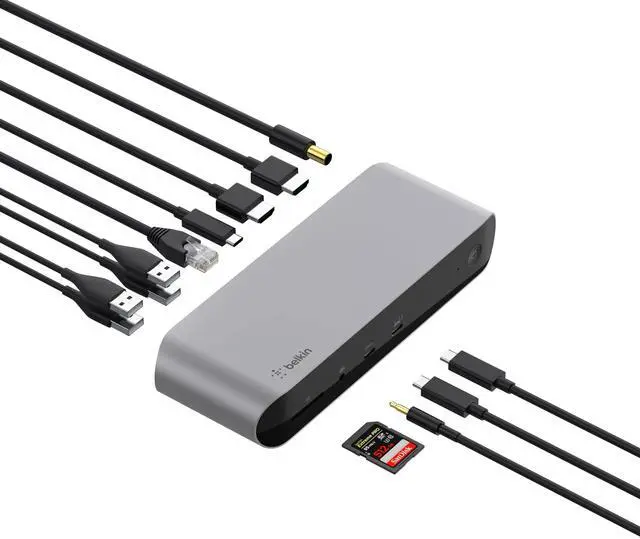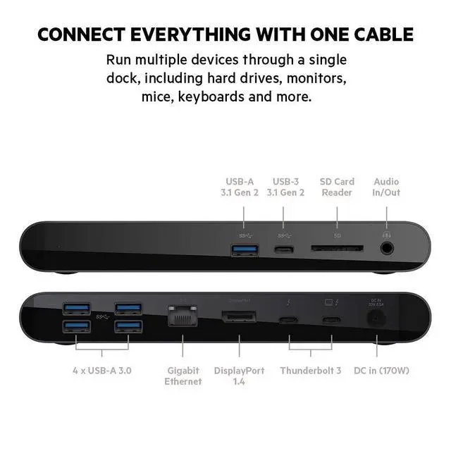 Introducing the Thunderbolt 3 Dock Pro - the ultimate docking solution for your Mac or Windows laptop. This smart, fast, and streamlined dock offers innovative solutions designed to suit both professional and at-home users. Enjoy super-fast data transfer speeds of up to 40 Gbps*, high-definition dual monitor support, and 85W upstream charging to power your connected laptop. It also features multiple ports to connect your peripherals and networks via USB-A, USB-C, Ethernet, SD, and more. Connect multiple devices to your laptop through a single dock, including monitors, hard drives, drawing tablet, mouse, keyboard, internet, and more.