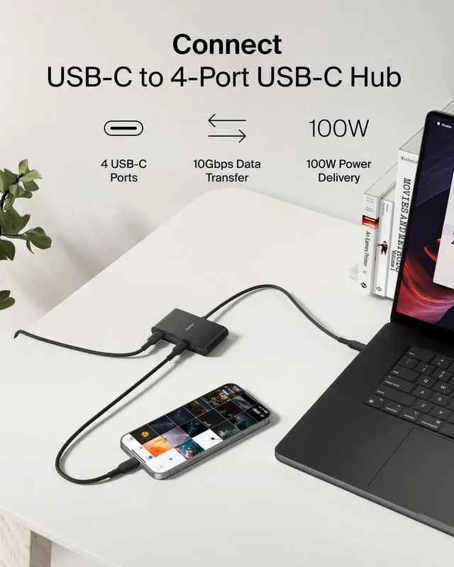 This 4-port hub delivers accelerated data transfer speeds, convenient compatibility, and supports a wide array of audio interfaces. This sleek, compact adapter plugs into your USB-C compatible MacBook, iPad, PC, or Chromebook to instantly expand your connectivity options. This hub supports webcams, video capture cards, external SSD PCIE hard drives, keyboard, mice and USB-C mics and headphones. Whether youre in your office or on the road, you can build a multipurpose workstation for creating, streaming, editing, or gaming. Transfer your data files seamlessly courtesy of up to 10Gpbs of bandwidth and enjoy pass-through Power Delivery charging up to 100W.