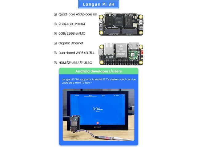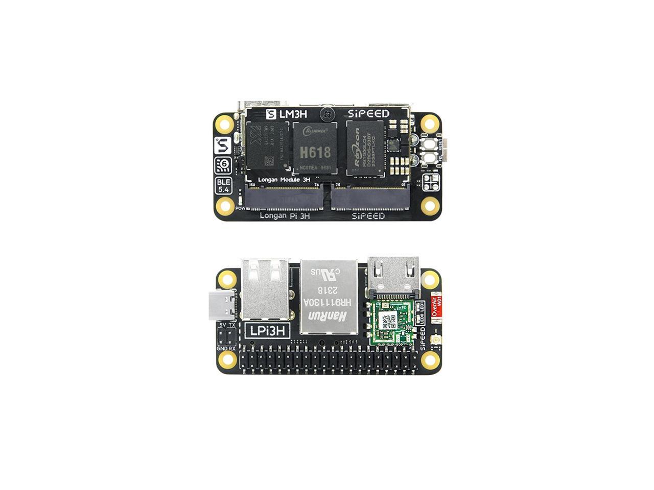 - [Greater Scalability] Sipeed LonganPi 3H single board computer onboard 2GB/4GB LPDDR4 RAM memory, none/32GB eMMC is added. It also supports MicroSD card slot. Size: 65mm ×31mm x 3.0mm, to achieve a balance between small size and full-size interface, Longan Pi 3H is designed with compact LM3H modules.