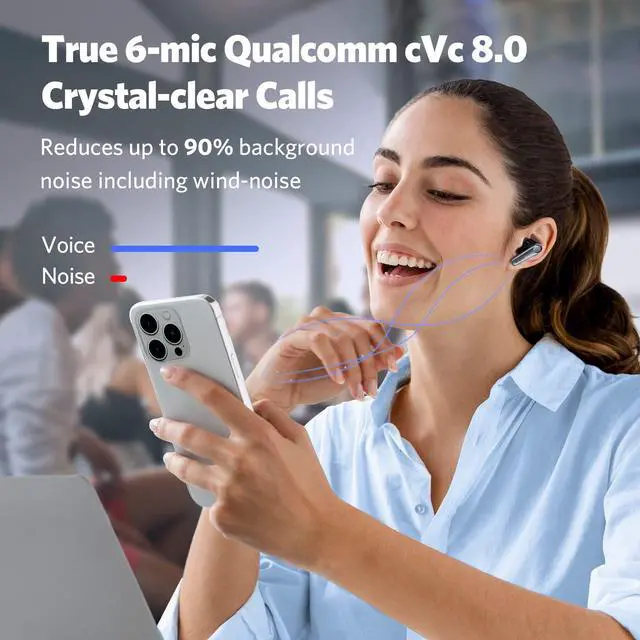 [Qualcomm cVc 8.0 ENC with 6 Mics] The wireless earbuds have 6 Environmental Noise Cancellation (ENC) microphones, combined with Qualcomm cVc 8.0 technology that picks up your voice clearly and blocks out unwanted background and wind noise, creating crystal-clear call quality.