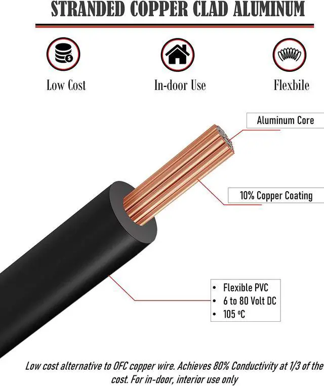 Single Conductor, Stranded Copper Clad Aluminum (0.2 mm dia/strand, 68 strands). Insulated and Jacketed in flexible PVC. Rated to 105 C
