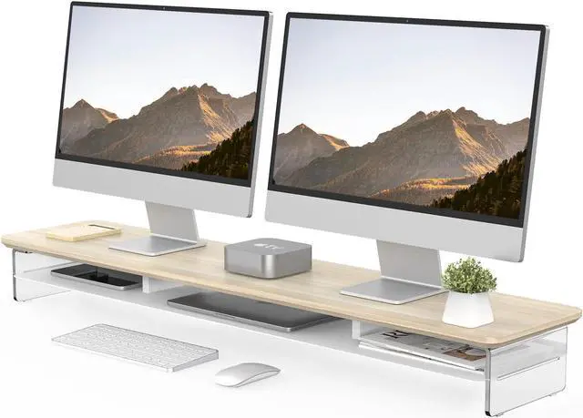• Sturdy & Stable: Monitor riser is 42.5 x 9.3 x 4.7 inches, with a board thickness of 0.7inches/18mm, and the middle layer is embedded with a whole piece of steel. The leg is made of 0.31inches/8mm high-quality acrylic material, the maximum load capacity is 45kg/99lbs, can easily handle either laptops or heavy monitors.