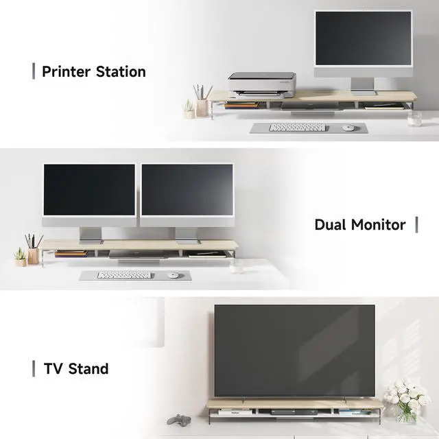 • Double Storage: The second layer is made of high-quality steel embedded into acrylic legs, and has three compartments; The bottom layer is a super large space of 40.3 inches, can be used to store keyboards, mice or other office supplies, adding more storage space and making your desktop tidier.