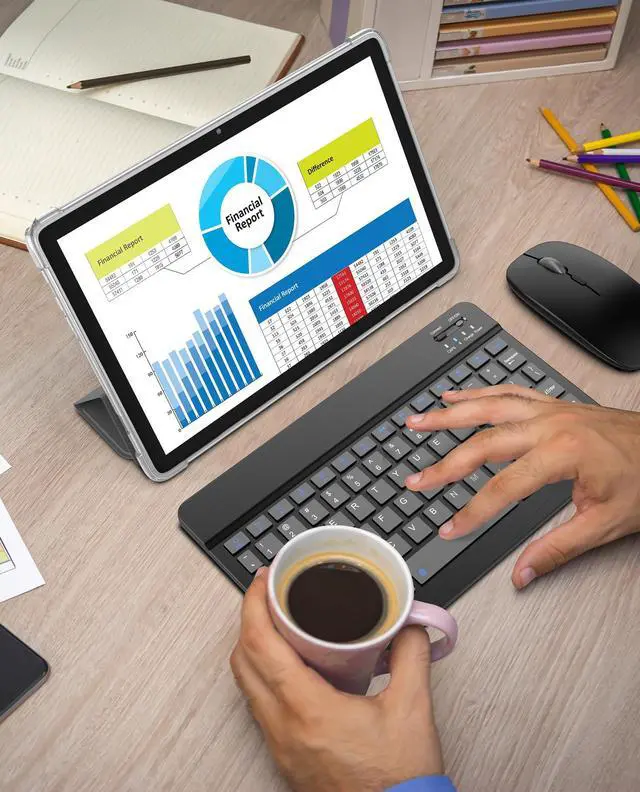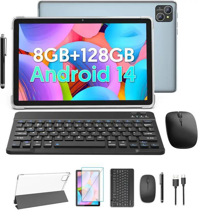 BAKEN 2024 Android 14 Tablet PC, 10 inch Octa-Core, 8GB RAM+128GB ROM, 1TB Expand, 8000mAh Battery, GMS, 2 in 1 with Keyboard, Mouse, Pen, Case, 5G WiFi6 (Grey)