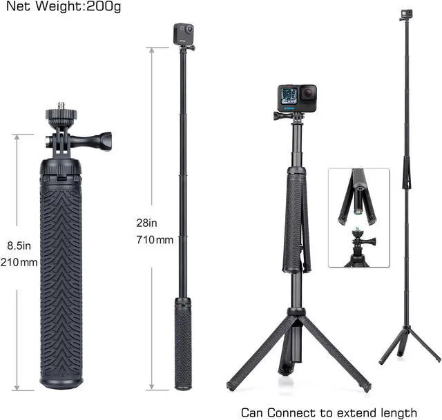 Multi-purpose for Use: It can be used as hand grip, telescoping selfie stick and tripod stand for your action cameras and cell phones. Portable for carrying and strong usability in various conditions such as traveling, surfing, diving, snowboarding, vlogging.
