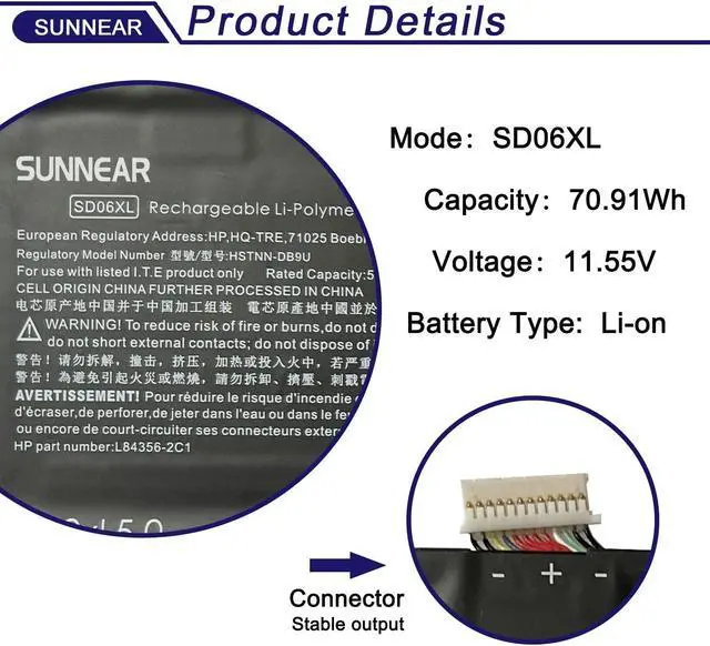 Compatible Part Number SD06XL HSTNN-DB9U L84356-2C1 L84392-005 L84392-006 SD06070XL SDO6XL