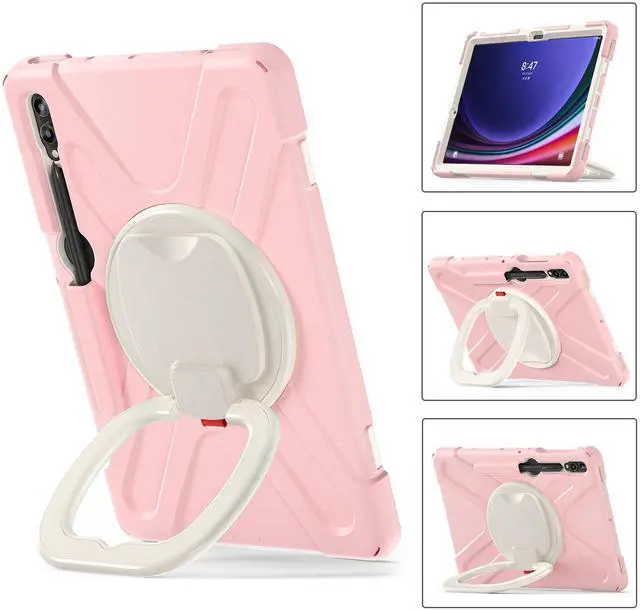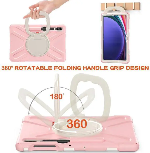 360 Rotation Case for Samsung Galaxy Tab S9+ 12.4 '' 2023/S8+ /S7+/S7 FEwith Shoulder Strap S Pen Holder Rotatable Kickstand/Handle Rugged Silicone Case (Pink)
