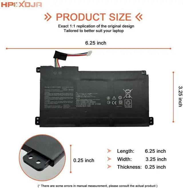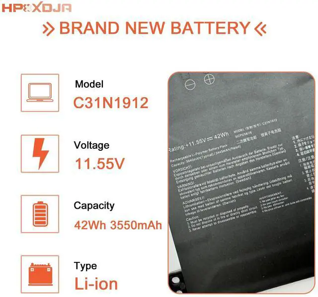 BATTERY SPECIFICATIONS: C31N1912 B31N1912 battery for Asus. Battery Type: Li-ion. Capacity: 42 Wh 3640 mAh. Voltage: 11.55 V. WHAT YOU GET: 1 * B31N1912 battery. 1 * User Manual. 4 * Screwdrivers