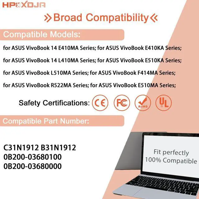 COMPATIBLE WITH: C31N1912 B31N1912 battery. for Asus VivoBook 14 E410MA Series. for Asus VivoBook 14 L410MA L410MA-BV037TS L410MA-BV053TS L410MA-BV058TS L410MA-BV076TS L410MA-BV077TS Series. for Asus VivoBook E410KA-EK139TS Series. for Asus VivoBook E510KA-EJ033TS Series. for Asus VivoBook F414MA L510MA R522MA E510MA Series