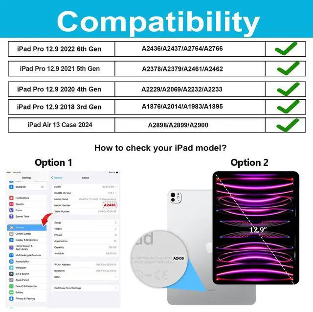 COMPATIBILITY: Case for Case for iPad Air 13 M3 2025( A3269, A3271)& iPad Air 13 M2 2024A2898/ A2899/A2900)& iPad Pro 12.9 Inch 2022 6th Generation ( model: A2436, A2437, A2764, A2766)& iPad Pro 12.9 Inch 2021 5th Generation ( model: A2378, A2379, A2461, A2462)& iPad pro 12.9 inch 2020 4th Generation ( model: A2229, A2069, A2232, A2233)& iPad Pro 12.9 inch 2018 3rd Generation (model: A1876, A2014, A1983, A1895)