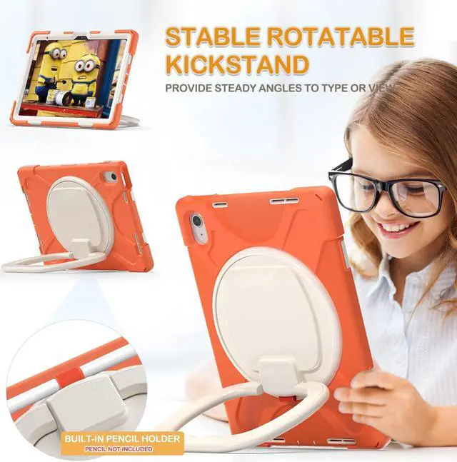 Multi-Function Handle / Kickstand: 360°rotating / 180°folding grip, can be used as a handle, easy to hang your iPad in kitchen, washroom, bedroom; Kickstand is stable enough to stand on different surfaces for children to view. Button and port cover enable to proof dust