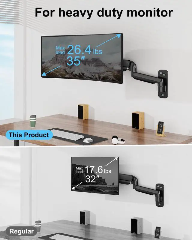 Ergonomic design - Helps to find an optimal ergonomic posture with this adjustable mount, increasing work efficiency and comfort. Wall mount for monitor is a great option for those who spend long hours in front of a screen