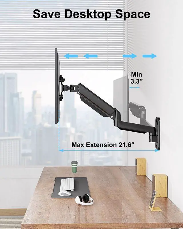Fully Adjustable Mount - Gas Spring Monitor wall arm offers an exceptional range of flexible motion featuring +90° to -90° tilt, 180° swivel, 360° rotation from landscape to portrait, and 12.2 inches of smooth height adjustment with gas spring lift.The arm can extend up to 21.6 inches and height adjustment reaches to 14.2 inches