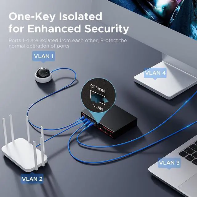 Security & Surveillance Optimized : ienRon 2.5g ethernet switch, 1-4 Port VLAN Isolation with a Single Switch! Block IP Camera Network Storms, Isolate AP Traffic, and Protect Critical Data.