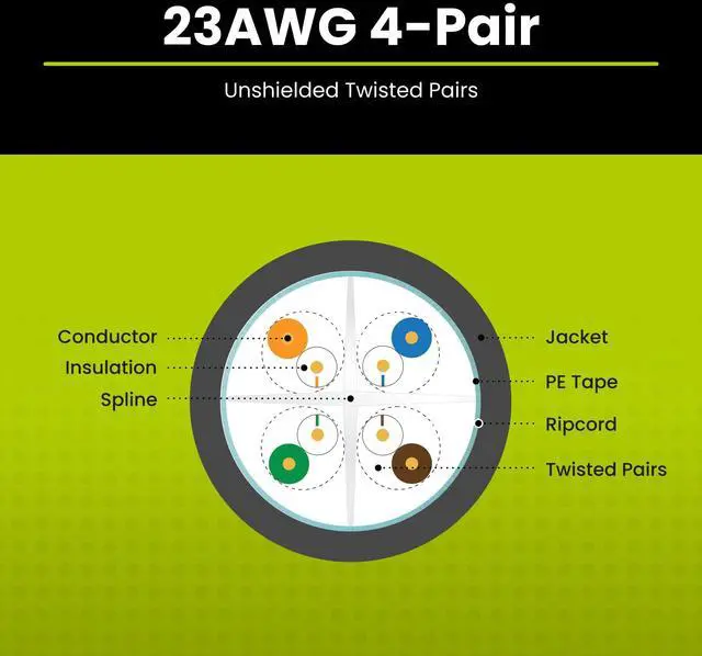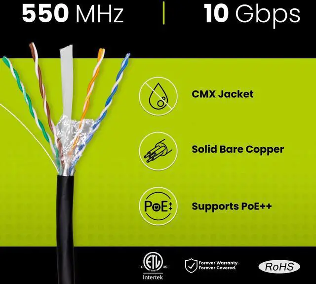 [High Performance Network Cable] Our outdoor cat 6 lan cable is 23 AWG with 4 pairs (8 conductors). Suitable for 1 and 5 Gigabit speed up to 328 feet and 10 Gigabit speed up to 165ft depending on the installation environment. Bandwidth tested up to 550 MHz. Supports Power over Ethernet: PoE/PoE+/PoE++ (IEEE 802.3af/at/bt) 4PPoE up to 100W.