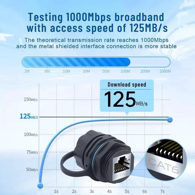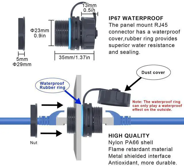 RJ45 female to female field installable coupler, no soldering, no installation tools, just plug the standard crystal head directly for quick installation.23mm thread mounting hole.Apply to cable size: Ø7.5-17.5mm