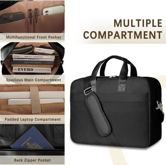 Multiple Compartments Laptop Bag : This laptop bag has four separate zipper compartments, large capacity can be good for storing and organizing daily supplies.The front multi-functional compartment can hold mobile power,mouse, pens and documents,etc;Main compartment can hold your wallet,magazines and books,etc.;The separate computer compartment can hold a 15.6-inch laptop and a 12.9-inch iPad; Small back zippered pockets can hold your keys, cell phone, passport, and other daily necessities.