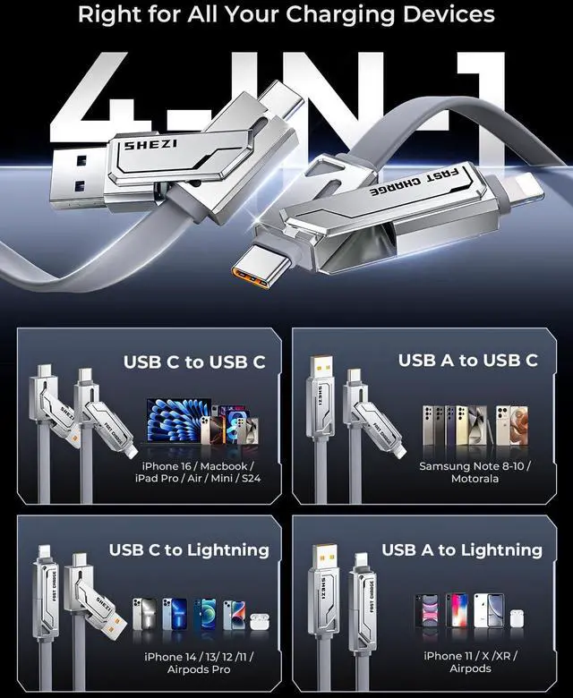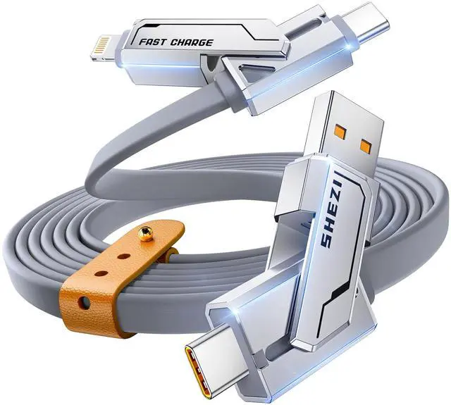 SHEZI 4-in-1 USB C Cable 240W 5FT Lightn-ing Cable [Fast Charging & Data Transfer] Flat Thick Silicone for iPhone/iPad Charger Cord, Multi Charge Wire Combo with Lightn-ing/USB C/USB A Port, Grey
