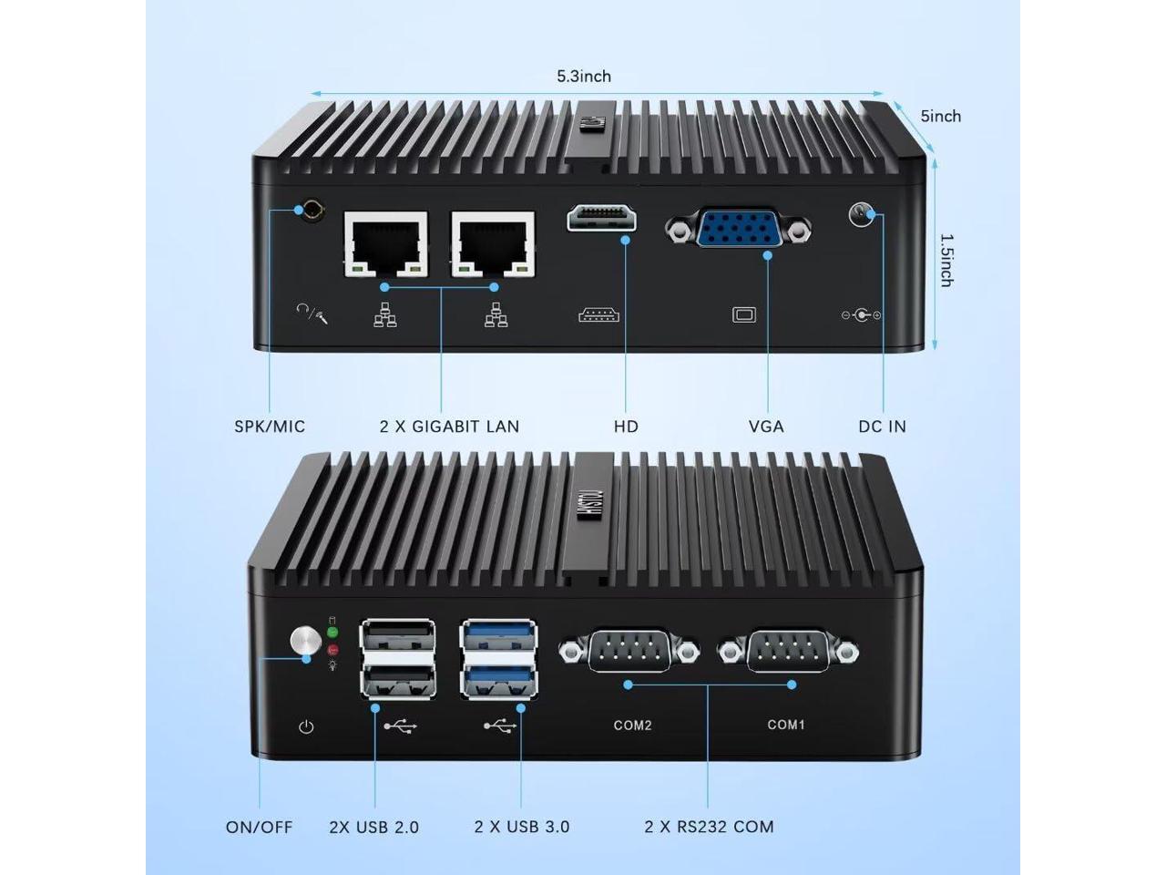 - Low Power Consumption & Energy Saving Fanless Mini PCIndustrial mini computer Size: 5.35*5.0*1.7 inch Net weight 0.75KG, Mini computers power about 30W, CPU is 15W, To run Office, home entertainment and Design applications very smoothly, Super Mini but Powerful, the performance is stable and effective in energy saving.