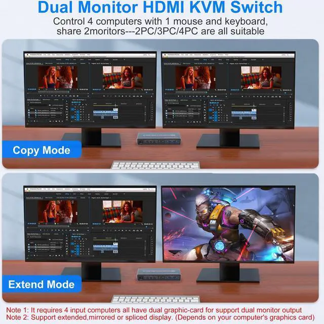 Support Ultra HD 4K Resolution: Our KVM supporting high resolution max up to 4K@60Hz. Note: Only when both your computer Graphics card and monitor support 4K@60Hz then you can get 4K@60Hz effect, so if you want the max resolution you have to check your devices first. And support copy mode and extension mode (requires your computer to have 2 HDMI port) copy mode: two monitors output the same picture, extender mode: two monitors output different pictures