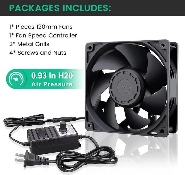 The fan includes a 12v multi-speed controller with 100v-240v ac power switch to set the fans speed to airflow levels for various environments.The ultra-quiet cooling fan contains premium dual-ball bearings, allowing it to be mounted horizontally or vertically to cool various electronics and components without worrying the lifespan
