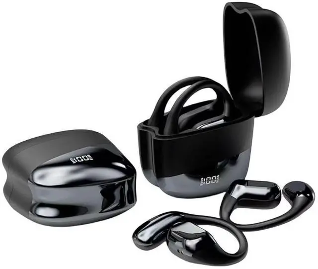 XIMAND Open Ear Clip Headphones, Air Conduction Wireless Earbuds Bluetooth 5.3 Sports Earphones Built-in Mic, Noise Reduction, 48H Playtime Charging Case LED Display, Fitness Running Ear Buds, Black