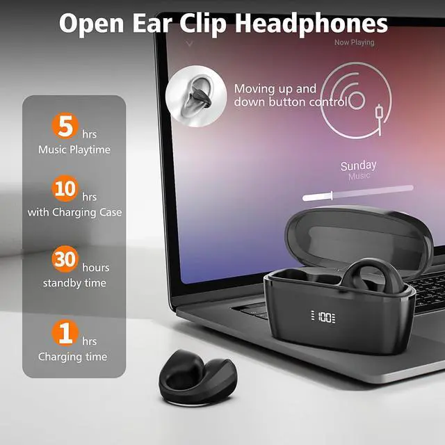 Wireless Earbuds Bluetooth 5.3, Open Ear Clip Headphones with Built-in Mic, 30H Playtime, Charging Case LED Display Fitness Earbuds for Sports (Black)
