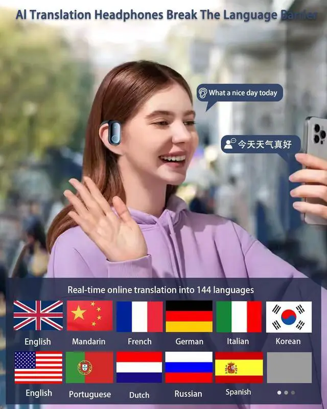 4-in-1 earbuds translatoropen ear earbuds Fashion,lightweight, ergonomic design ensures a secure and comfortable fit even during extended use, providing a pressure-free wearing experience. The open design of the earbuds translator ensures that the ears will not be blocked, Deliver immersive and crystal-clear translations, music, and calls, business trips, international travel, transl