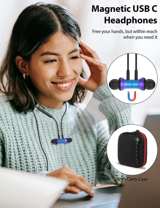 ELOLOHI USB C Headphone for Samsung S21 Wired Earbuds Magnetic in-Ear Type C Earphone with Bass Stereo Noise Canceling for iPad Pro Galaxy S20 FE Note 20 Pixel OnePlus 9 8T