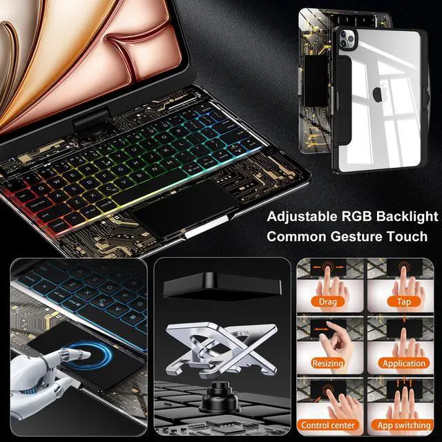 CNAIDUNR Transparent 360°Rotatable Keyboard Case for 2024 iPad Pro 11-inch (M4), Clear Hard PC Back, Trackpad, Pencil Holder, 7 Color Backlight, Black