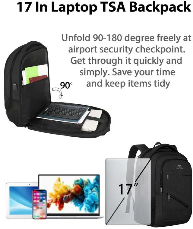 TSA Backpack: TSA function is exclusively designed for airplane flight travel. At checkpoint, unfolds the laptop travel backpack freely 90-180 degrees and the laptop stays flat without taking it from the bag, making it getting through airport security checkpoint more easily. This 17 inch laptop backpack is large and lightweight enough for travel, hiking, vacation, weekend getaway, overnight trip