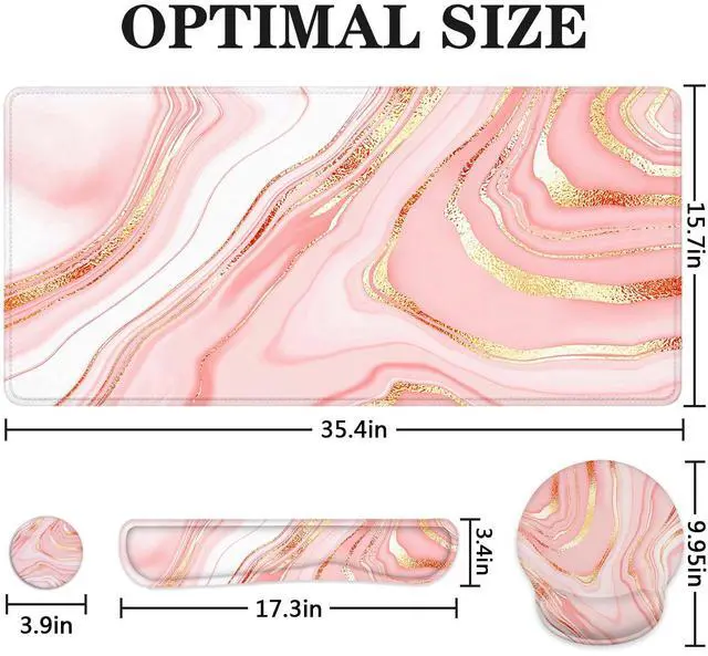 Large Mouse Pad & Wrist Rest SetOur large mouse pad and wrist rest set includes XXL gaming mouse pad (35.4''x15.7''), keyboard wrist rest(16.9''x3.5''), mousepad wrist rest(9.9''x8.7''x0.8''), cup coaster(3.9x3.9''). This extended desk mat for keyboard and mouse is large enough to fit your mouse, gaming keyboard, and other desk items.