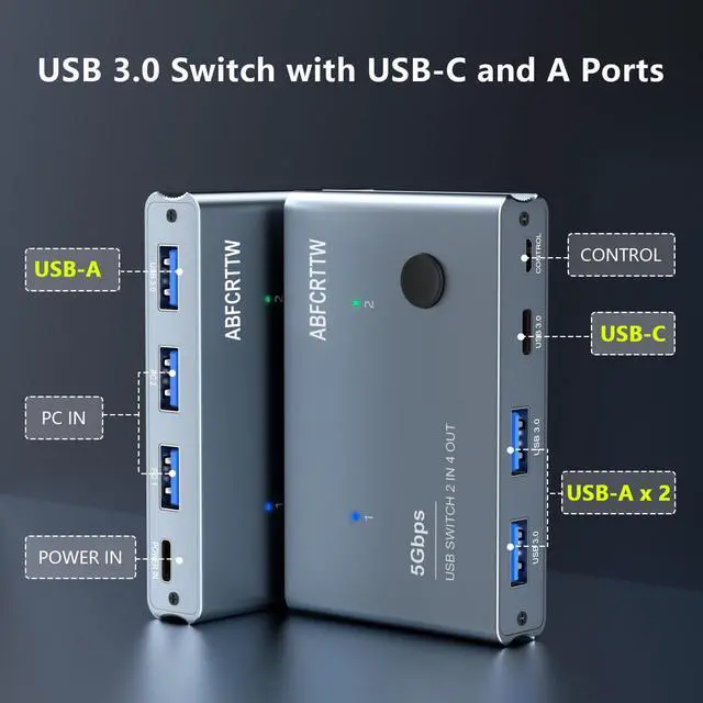 1 USB-C and 3 USB-A Ports The usb 3.0 switch features 1 USB-C port and 3 USB-A ports, enabling you to connect traditional USB-A devices as well as new USB-C devices. This helps you share more advanced USB-C devices, such as the latest USB-C smartphones and headphones, between the two computers.