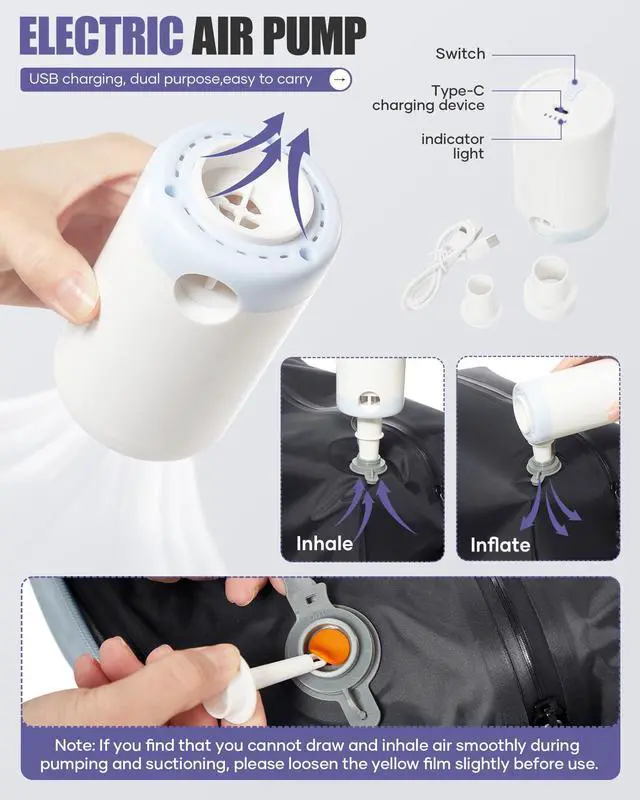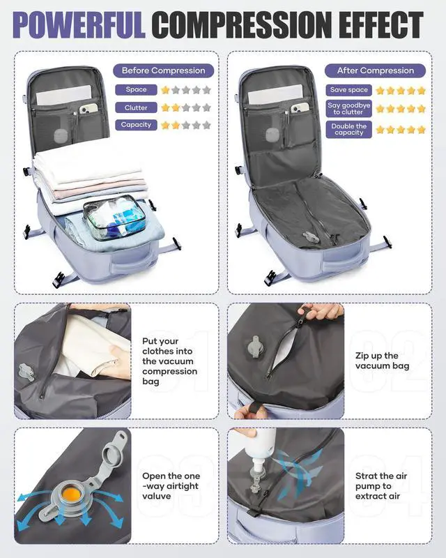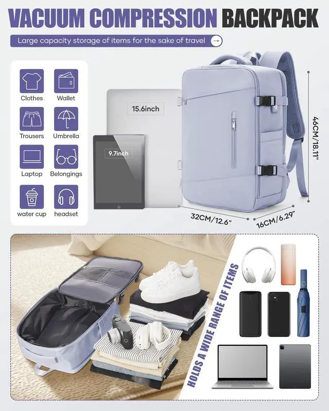 This vacuum travel backpack has a built-in vacuum bag and vacuum compression to maximize packing efficiency. You can put your clothes into the vacuum bag, zipper it tightly, open the one-way air vent valve, and compress it by squeezing or electric air pump to reduce the volume occupied by your items and load more items.