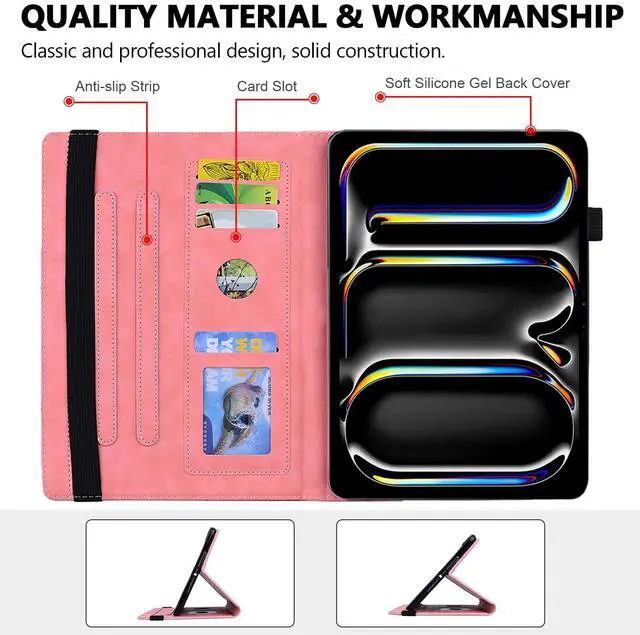 iPad Pro 13" M4 Textured PU Leather Flip Cover Case with Elastic Band, Credit Card Slots and Apple Pencil Holder