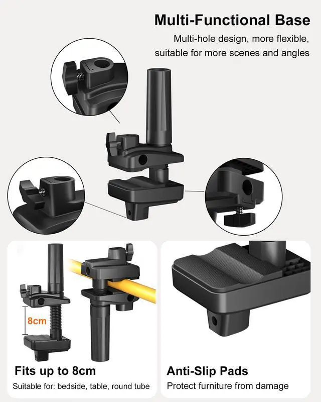 Multi-Functional Base, Flexible Installation: Equipped with 3 mounting holes of arm on the base, giving you the flexibility to choose the most comfortable mounting angle and position, Unlike other stands limited to flat surfaces like tables or desks, our base has a curved design, allowing it to be mounted on round tube and opening up more installation possibilities for your space. With non-slip pad, it not only increase friction for a secure hold, but also protect your furniture from damage