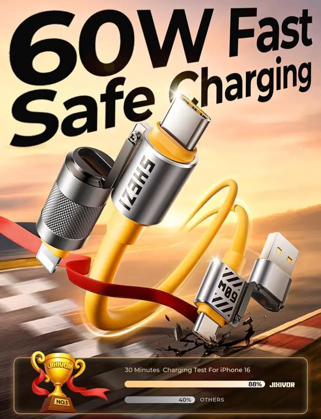 No Wait,Nice ThingsThe Jixivor compatible with Lightning cable output power up to 60W, which is ensured by high-speed safe charging In order to make your devices get charged in an instant, we've adopted silver-plated conductors, cut d