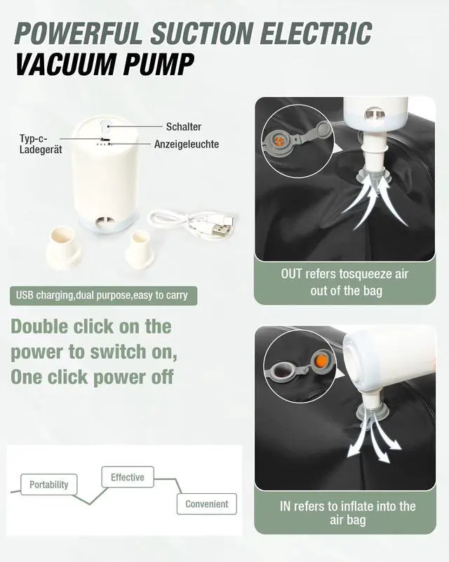 Vacuum system: We're including an electric vacuum pump with every purchase (Charge cable included) .Press the switch on the electric pump twice, and it will spring into action immediately, rapidly removing air from the bag. Its powerful suction ensures a tight vacuum seal is achieved in no time which drastically reduces the volume of your stored items.Once you're finished, a single press of the switch turns the electric pump off.