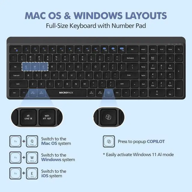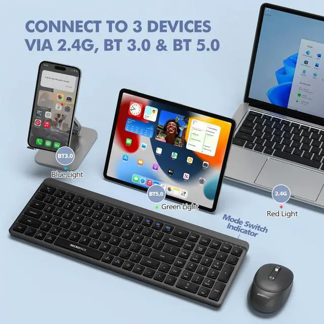Bluetooth Wireless Keyboard and Mouse ComboConnect up to 3 devices via 2.4GHz and Bluetooth 3.0/5.0, and switch between them using Fn + the mode switch key.